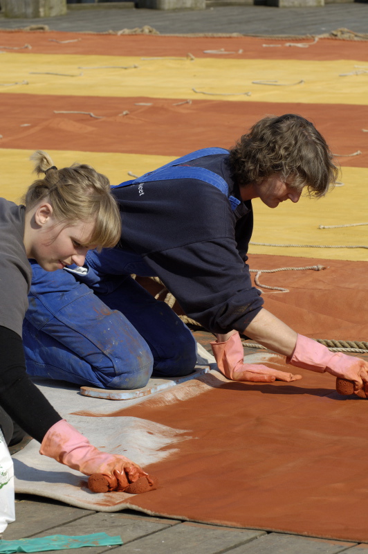 Hørsejlet males med en blanding af saltvand og okker. Opskriften kendes fra venetianske bomuldssejl.Leder af bådeværftet Martin R. Dael
